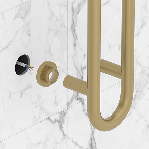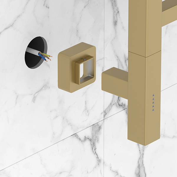 Накладки устанавливаются на модуль скрытого подключения и полностью скрывают все технические элементы. По форме они повторяют отражатель и воспринимаются как естественное продолжение полотенцесушителя — без ощущения добавленного элемента.